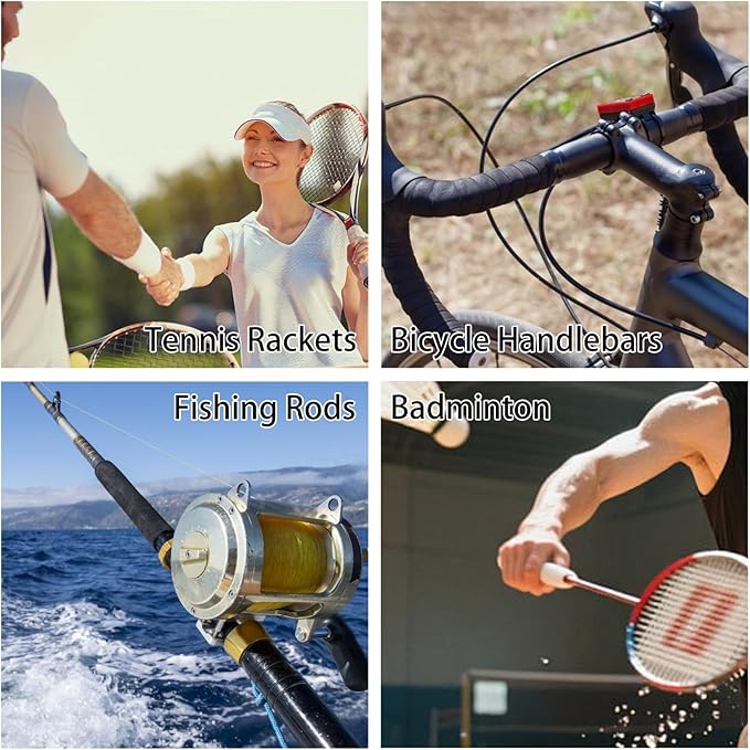 - Widely Used: : Handle grip tape is not only suitable for tennis, badminton, pickleball,squash rackets, but also for fishing rods, bicycle handlebars, motorcycle handlebars, etc.